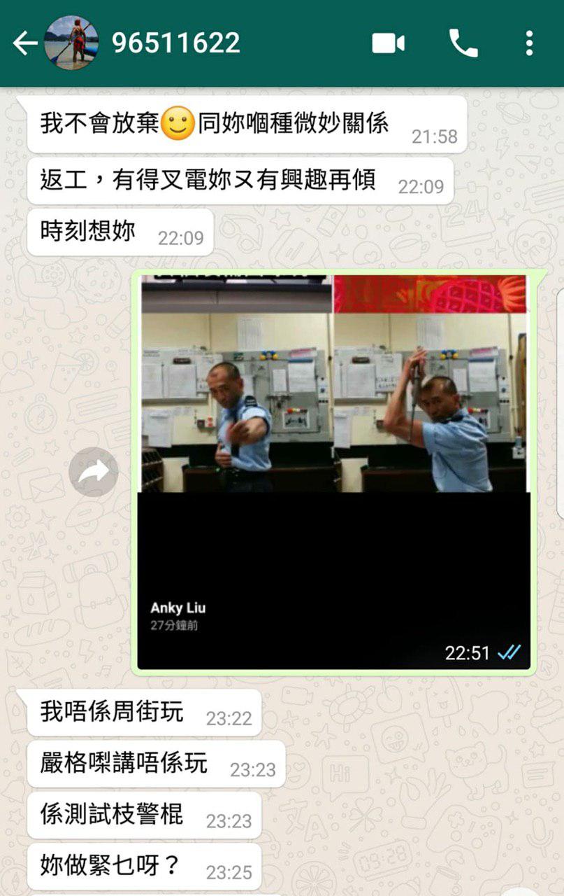 網上曾經有一段佢係警署內揮舞警棍嘅片段流傳。據知情人士指出,佢本來守槍房,負責派發、收返槍同子彈俾前線警察,以及文書等其他後勤工作。係揮警棍事件後,被調去做前線警員,可能涉及鎮壓示威者。