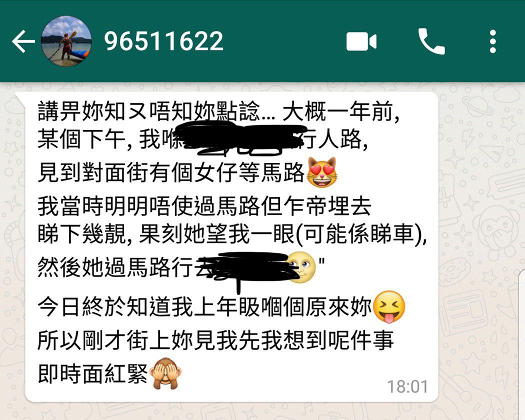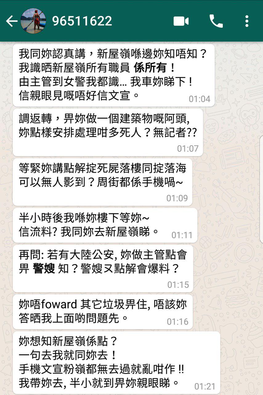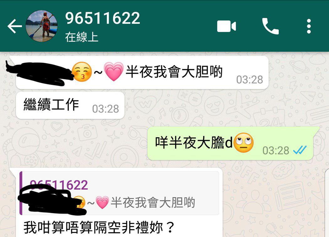 佢係網上自稱45歲已婚,有兩個仔,但最近竟然仲去識年輕女性。然後就不停騷擾佢,仲話好想錫佢、攬佢、一齊訓,又痴漢式咁埋伏喺佢屋企附近,話想車佢去新屋嶺參觀一下,詳見以下對話圖: