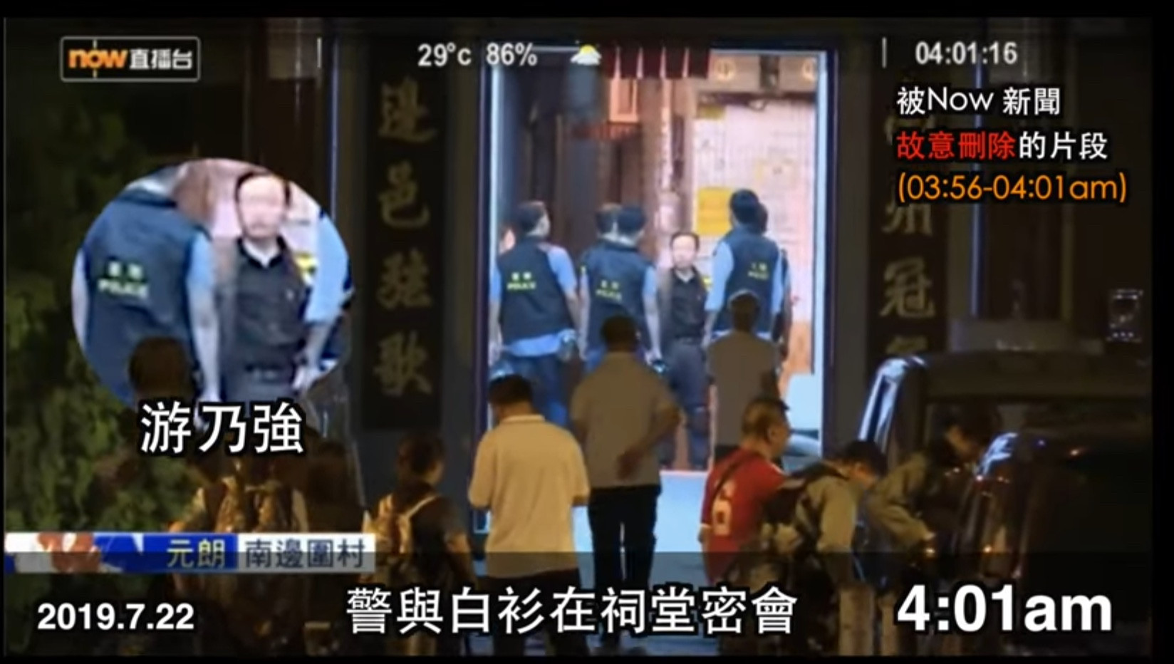 游乃強係2019年7月22日凌晨四點零一分,係警察圍堵元朗恐佈份子嘅聚集地南邊圍嗰時,走入村內村公密會恐怖份子,無拘捕任何人,及後係五點十一分,佢公開向傳媒表示無發現南邊圍入面有任何人手持攻擊性武器,顯示游乃強身為警察,有份同黑社會合作。游乃強密會恐佈份子嘅情景曾經俾NOW新聞拍攝到並上傳至Facebook,但呢段片曾經離奇消失,及後俾網民重新上傳到YouTube。圖片如下: