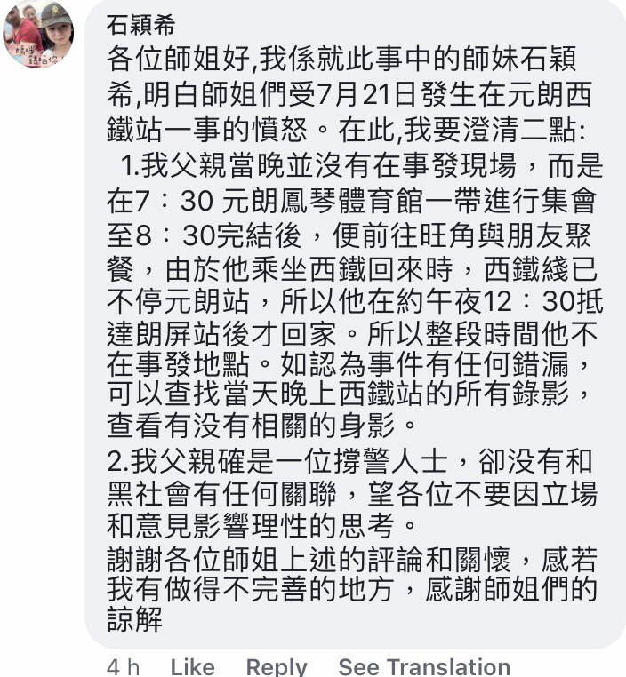 石穎希係親中人士石房有嘅二女,佢曾經係PTMS Secrets上面發表過支持佢父親嘅言論,如下圖所示: