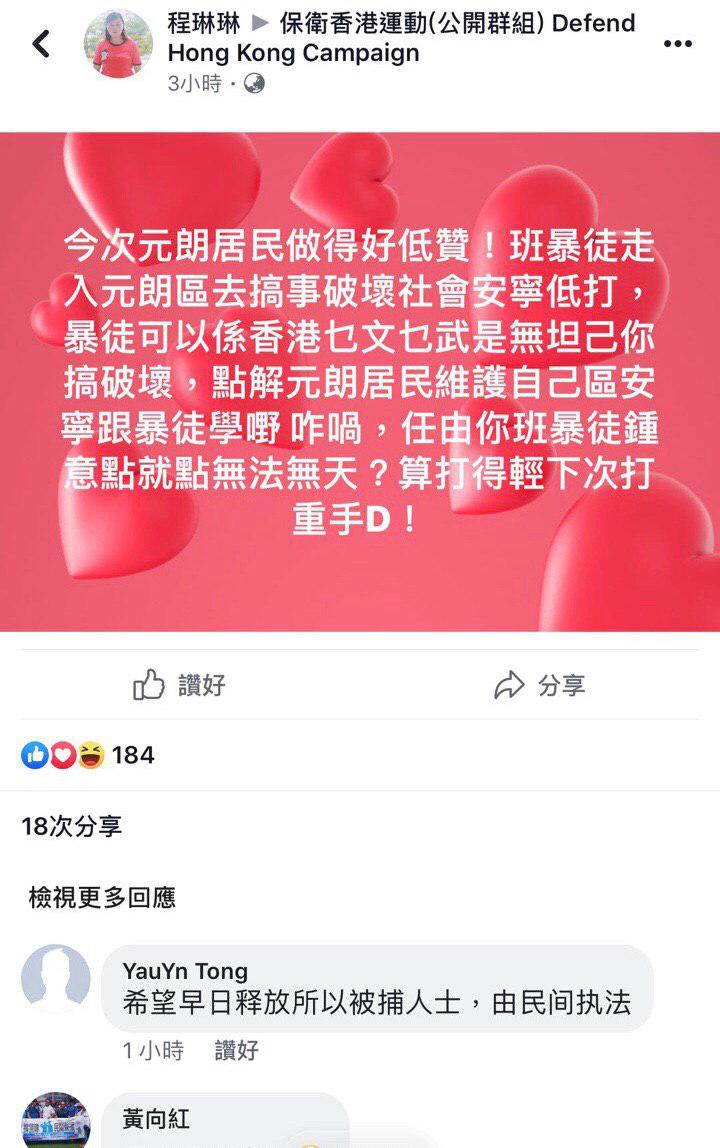 佢曾經轉發支持元朗恐佈份子嘅言論,如下圖: