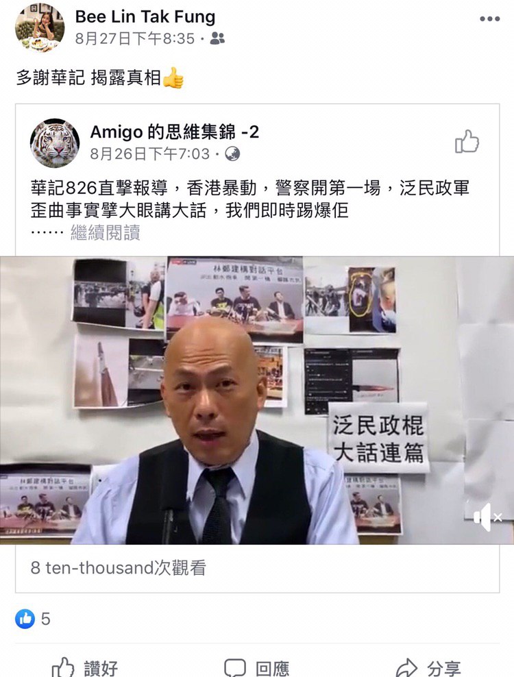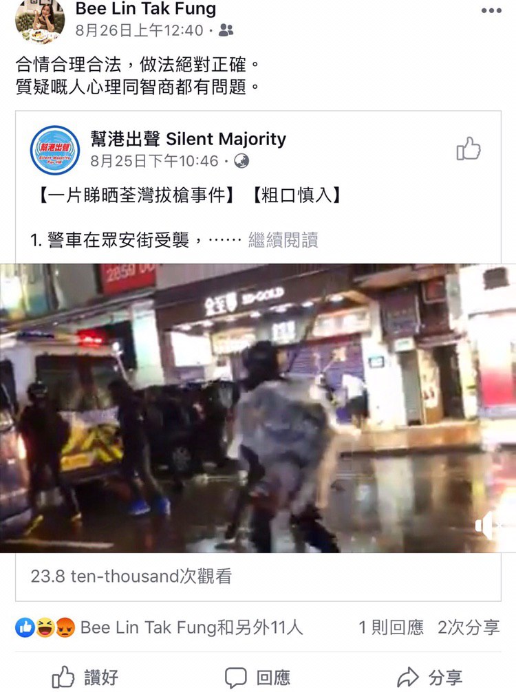 佢經常係Facebook轉發支持中國及香港警察嘅文章,詳見文底圖片。