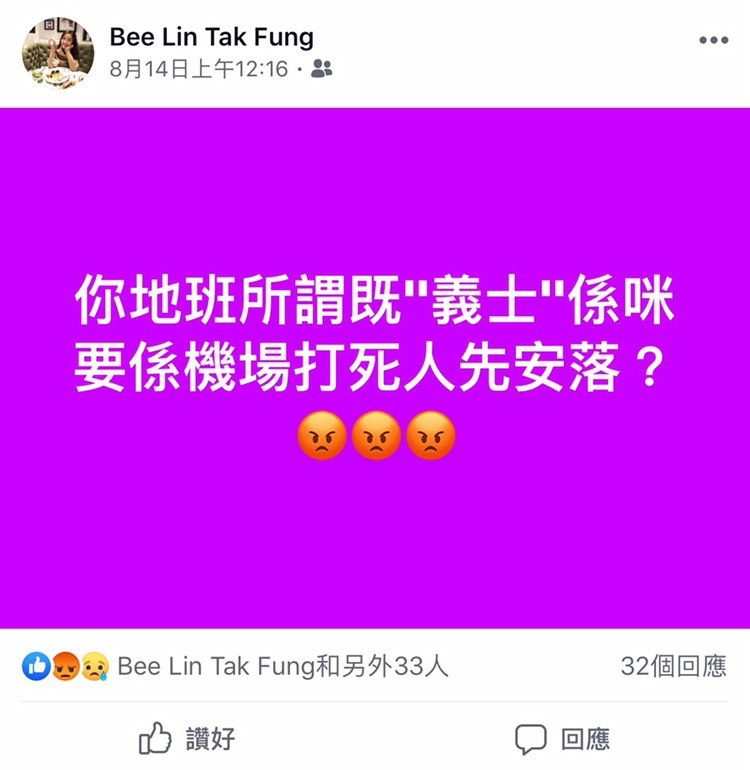 據讀者資料,佢係來自中國嘅新移民,曾經係Dior做過幾年,之後去左宏利做保險,專做大陸客,之後又返Dior做,而家係機場返工。佢亦有份支持警察開槍,認為示威者係「曱甴」。