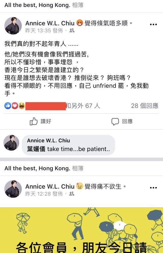 佢曾經多次係Facebook發表親中撐警言論,詳見下列圖片。