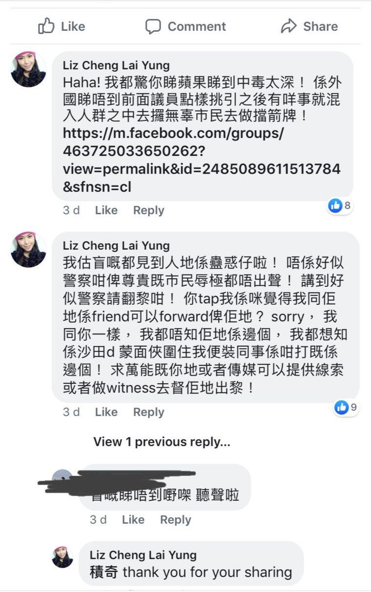 佢曾經係Facebook上批評前往示威現場嘅立法會議員,見下圖: