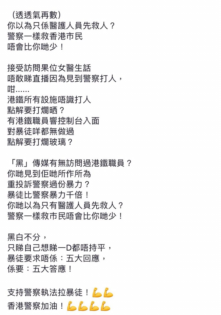 鍾倩馨係一名撐警藍絲,支持香港警察濫權濫捕並為此歡呼。