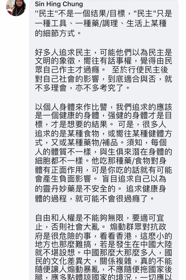 佢經常係Facebook讚揚中國有幾偉大,支持中國實行獨裁制度,鬧示威者係暴徒及支持警方執法。佢亦認為示威者比警察暴力千倍,寧願同情死物。以下係佢係Facebook發表嘅言論: