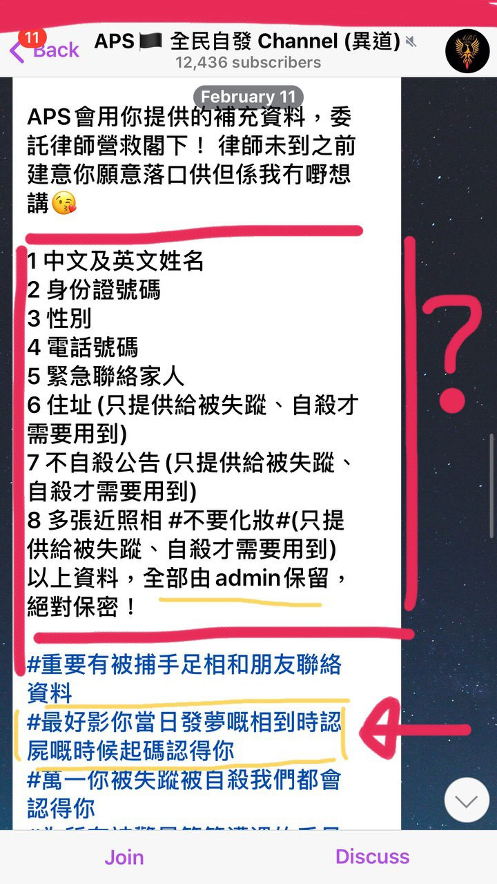 除此之外,佢亦曾經係Telegram頻道上公開要求示威者「預先」向佢地提供個人資料,疑似故意收集示威者嘅個人資料,交俾香港警察,以下係APS全民自發Telegram頻道嘅相關內容: