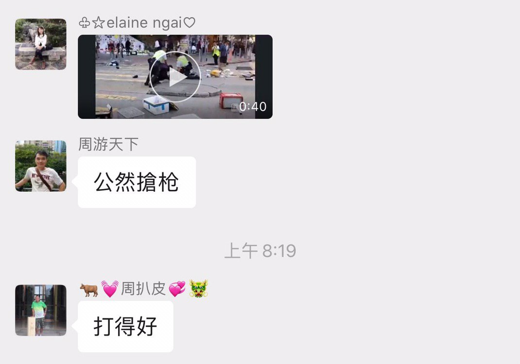 佢曾經係WeChat參與支持警察開槍射殺抗爭者嘅討論,詳見下圖: