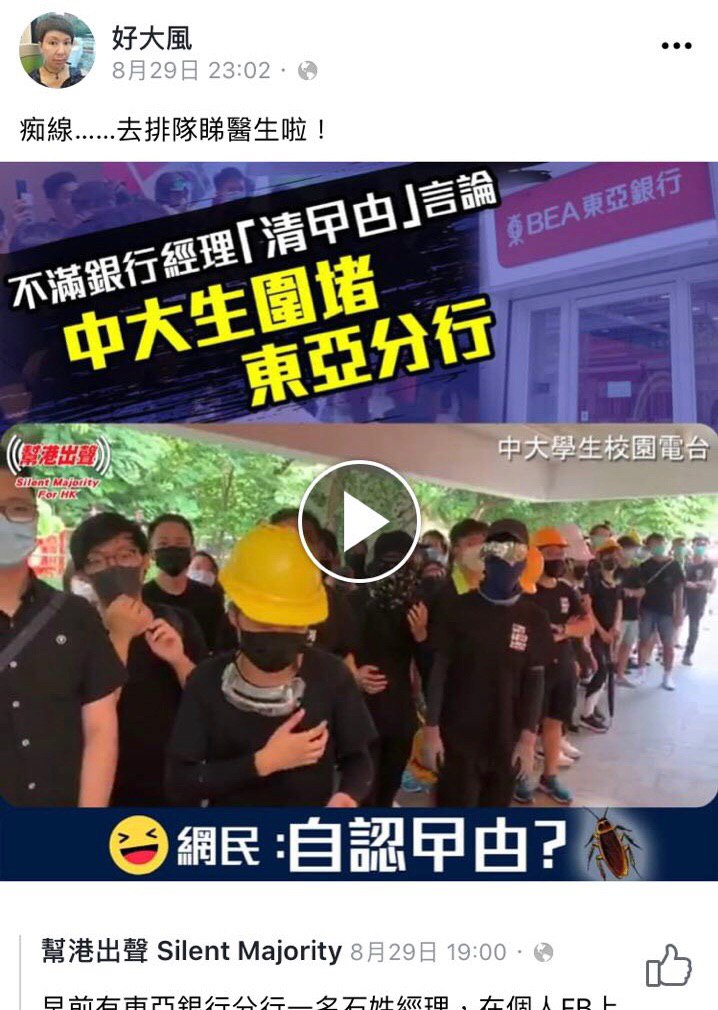 佢曾經係Facebook發表大量親中、撐警言論,包括稱呼示威者係曱甴等。