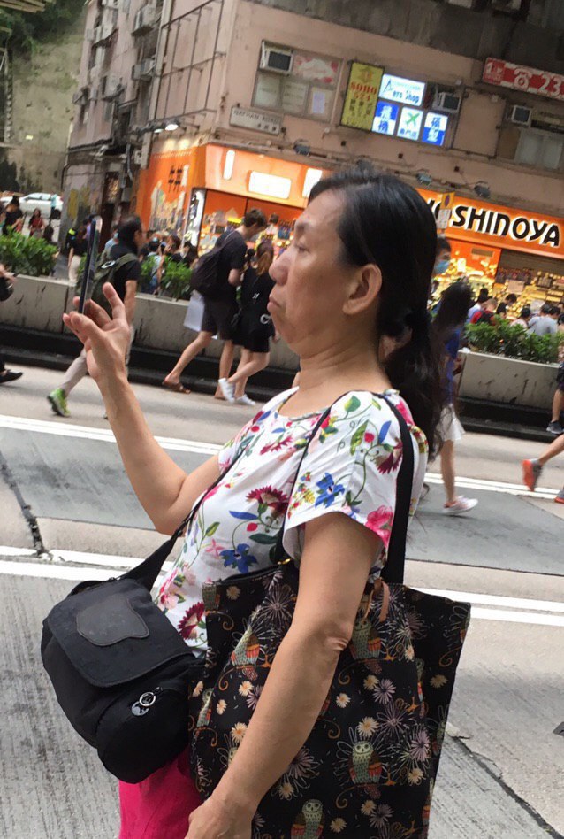 此人(群)是親中派的一名成員或支持者。她曾經在2019-07-21示威期間,在金鐘一帶拍攝示威者之容貌,以作舉報之用。