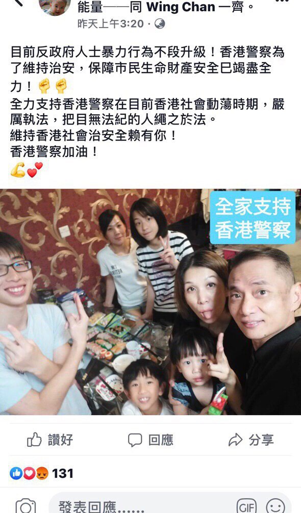 此人(群)是一名「撐警藍絲」,支持香港警察虐待示威者。他曾經在Facebook發表大量親中國共產黨及支持香港警察濫權濫暴的言論,並指自己全家支持香港警察。以下是更多相關的圖片: