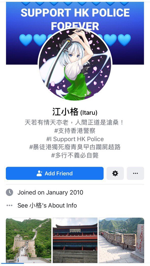 此人(群)係一名撐警藍絲,支持香港警察虐待示威者。佢曾經係Facebook辱罵手足,又參加包圍香港電台嘅集會。
