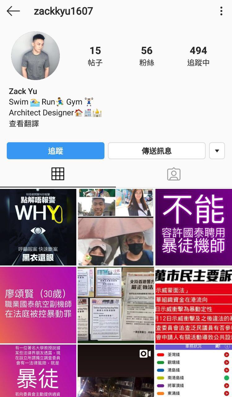 Zack Yu係一名撐警藍絲,支持香港警察濫權濫捕並為此歡呼。佢曾經係Instagram散播示威者個人資料及辱罵示威者。